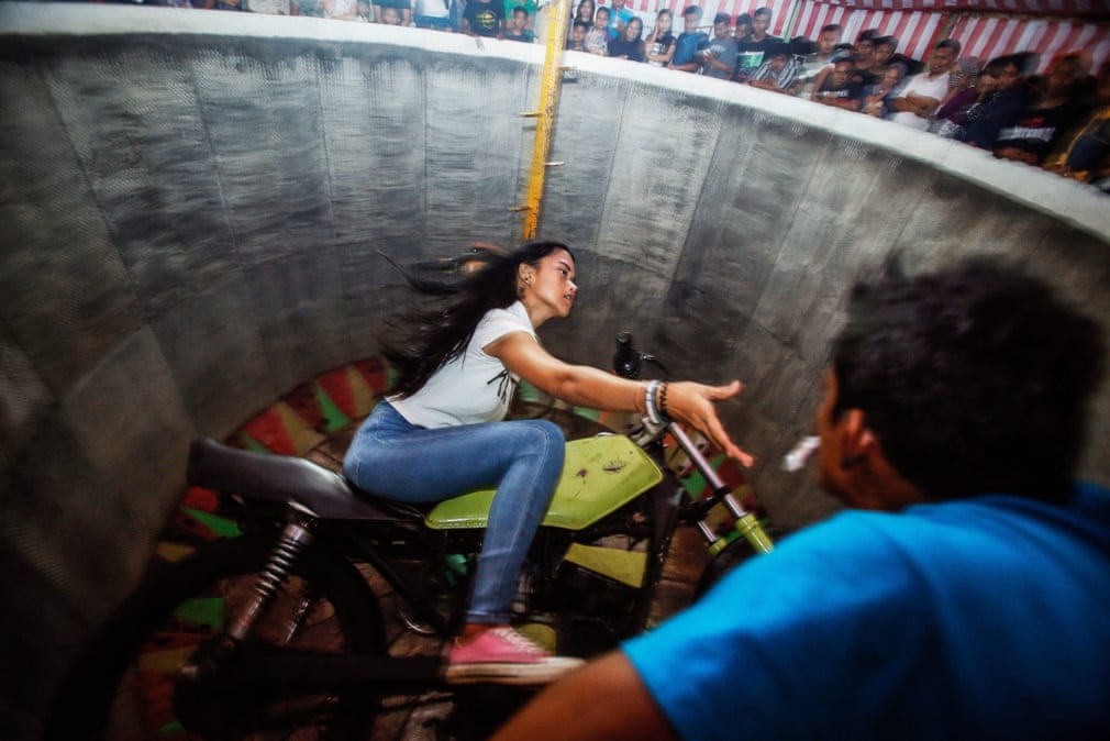 (Karmila Purba seorang pembalap perempuan sepeda motor berusia 18 tahun, menarik perhatian kerumunan penonton saat dia tampil di sebuah pertunjukan lokal 'Tong Setan' atau Devil’s Barrel).