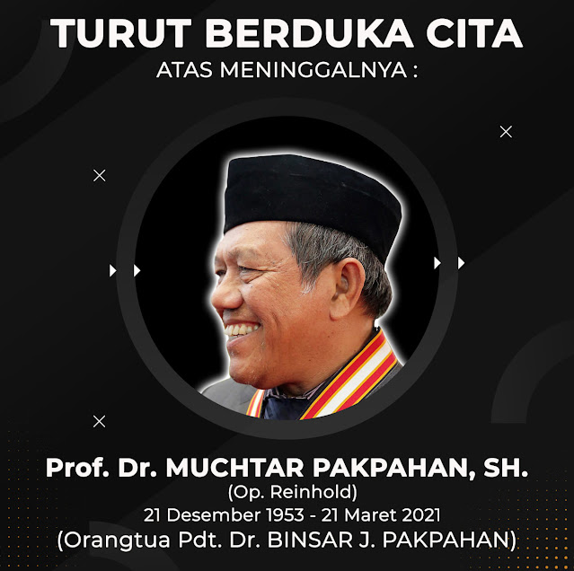 (Telah meninggal dunia Bapak Prof. Dr. Muchtar Pakpahan, SH, MA. (Op. Reinhold doli), umur 67 tahun Ayah dari Bapak Pdt. Dr. Binsar Jonathan Pakpahan. Mari Bapa, Ibu dan kita semuanya bawakan dalam doa agar keluarga yang ditinggal diberikan penghiburan dan diberkati Tuhan Maha Pengasih).